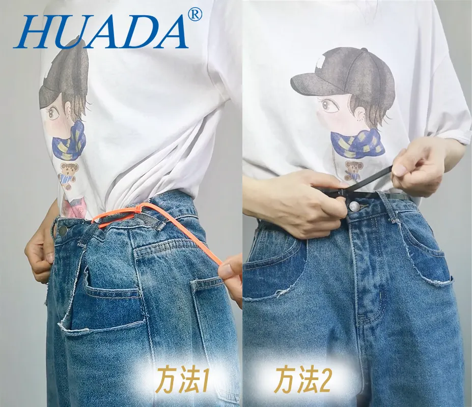 方法1:将扎带从裤腰的两个皮带孔穿过,一拉即紧!
