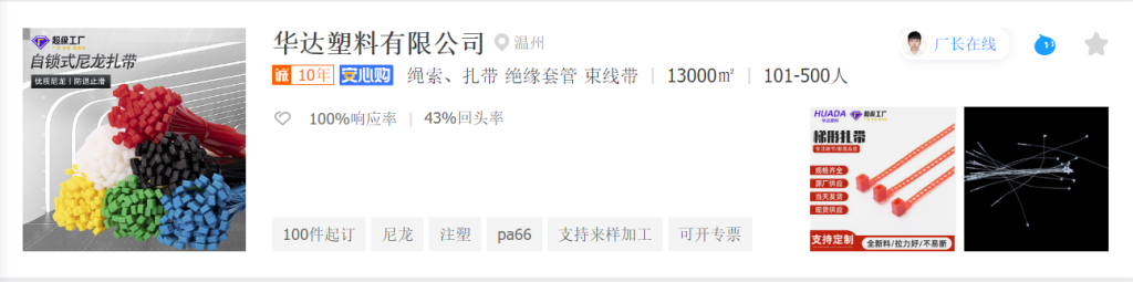 - 可以看出我们是拥有10年诚信通的,阿里巴巴认证扎带生产厂家。