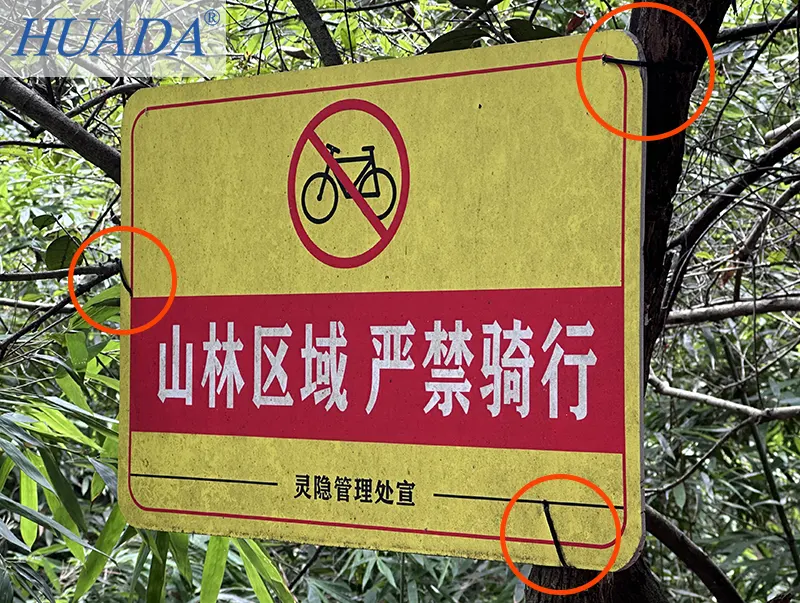 - 重型路牌支撑:如图材质较重的户外指示牌,采用自锁式不锈钢扎带直接固定在立柱或支架上。这类扎带具有出色的抗拉强度与耐腐蚀性能,比起尼龙扎带来效果更稳定,适合在夏季高温、强紫外或多雨等极端气候下长期使用。